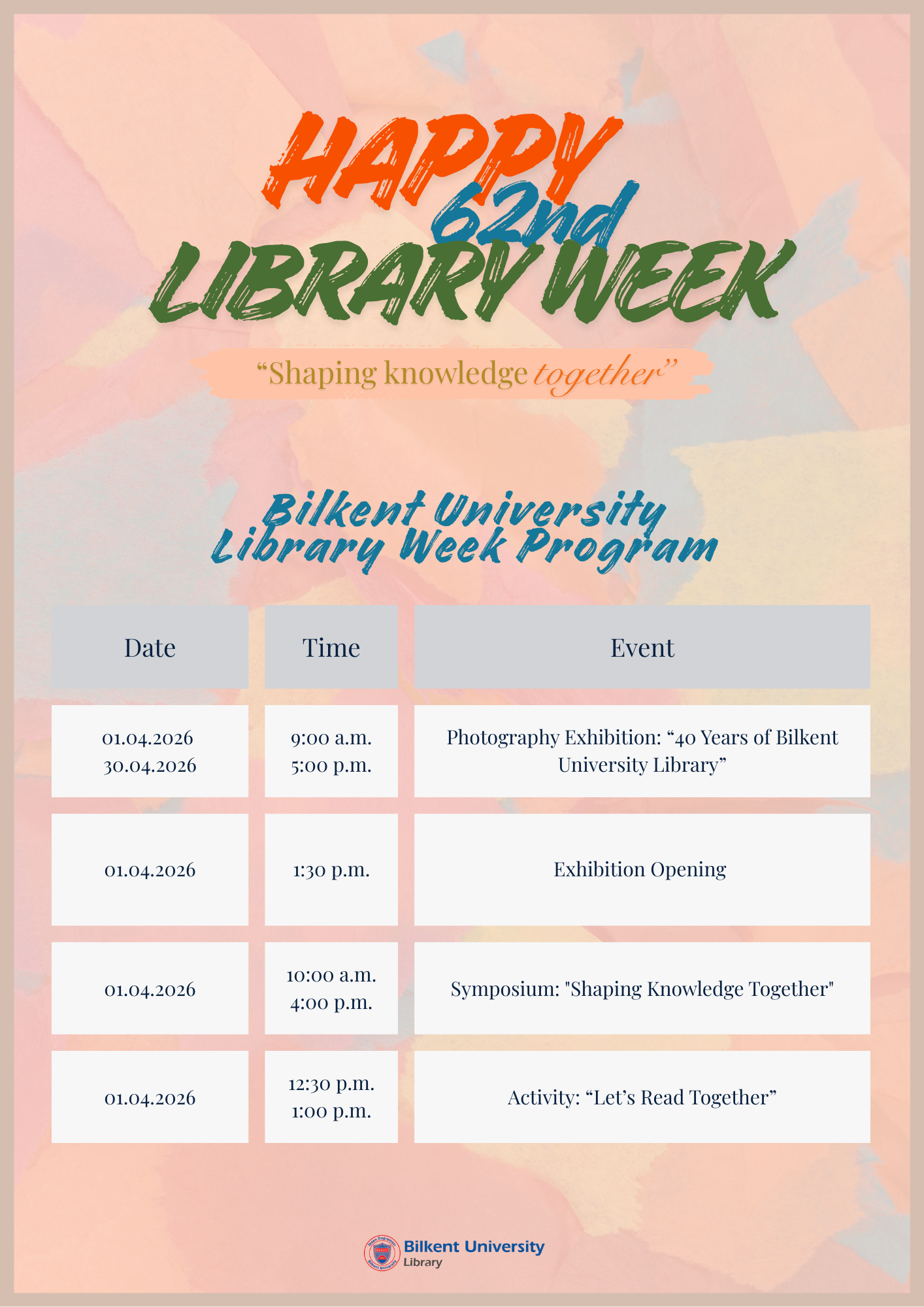 As Bilkent University Library, we are celebrating the 62nd Library Week and the 40th anniversary of our library with a series of events from March 30 to April 5, 2026. You can find the event schedule below.